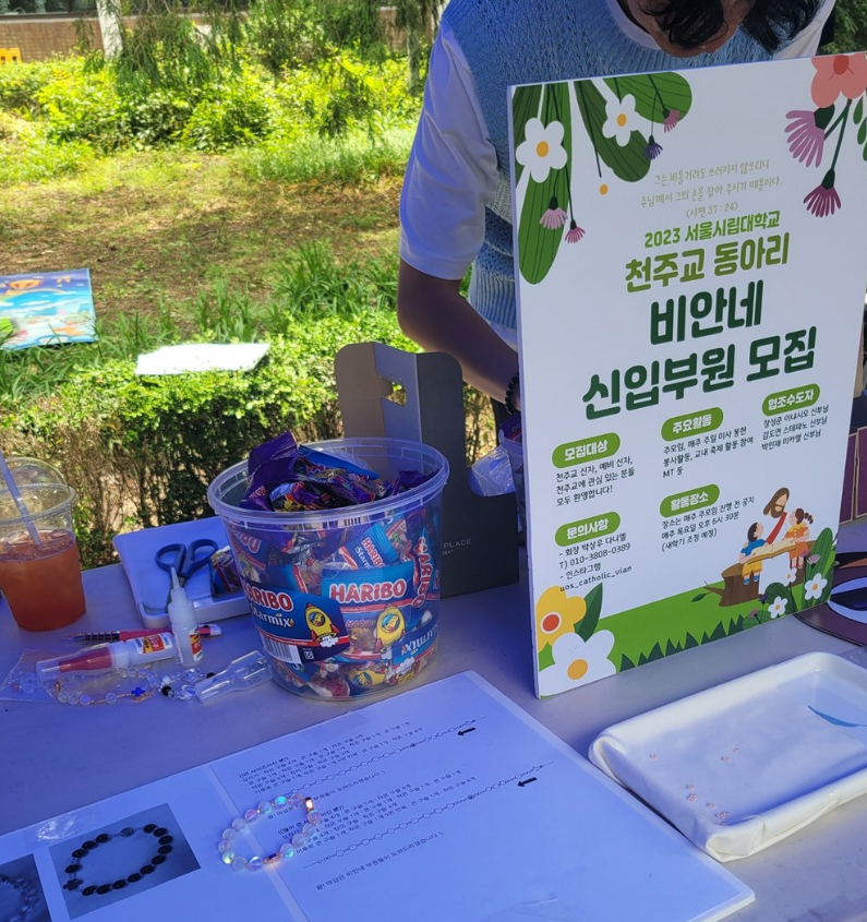 5월 22일부터 5월 24일까지 서울시립대학교는 대동제를 개최했는데요! 우리 비안네는 작년과 마찬가지로 학우 여러분들을 만나기 위해 23일, 24일 이틀동안 동아리 부스를 운영하였습니다 🙂 저희가 준비했던 컨텐츠는 ‘묵주 팔찌 만들기’와 ‘비즈 키링 만들기’, 그리고 소량의 ‘기도나무 소원빌기’였습니다. 비즈를 고르는 일부터 디자인까지 모두 비안네 부원들이 직접 도맡아 만들었던 팔찌와 키링이었답니다!
