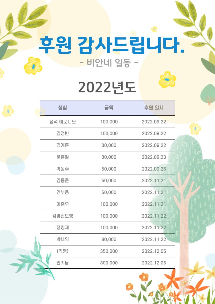 • 후원금 사용내역은 후원하기->지출내역 메뉴로 확인하실 수 있습니다. (필요 시 로그인)